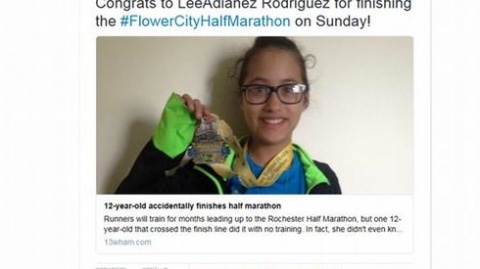 به گزارش سیتنا، یک دختر ۱۲ ساله نیویورکی به طور اتفاقی در یک مسابقه نیمهماراتن شرکت کرد و مدال گرفت. این دختر نوجوان که لیآدیانز رودریگوئز نام دارد برای شرکت در یک کارزار سلامتی در یک دوی ۵ کیلومتری ثبت نام کرده بود اما در روز مسابقه با تصور اینکه دیر رسیده و مسابقه آغاز شده به جمع کسانی که برای شرکت در مسابقه نیمهماراتن در آنجا بودند پیوست. بنابراین او به جای اینکه پنج کیلومتر بدود، ۲۱ کیلومتر دوید. او موفق شد نیمهماراتن را در دو ساعت و ۴۳ دقیقه و ۳۱ ثانیه به اتمام برساند و مدال بگیرد.