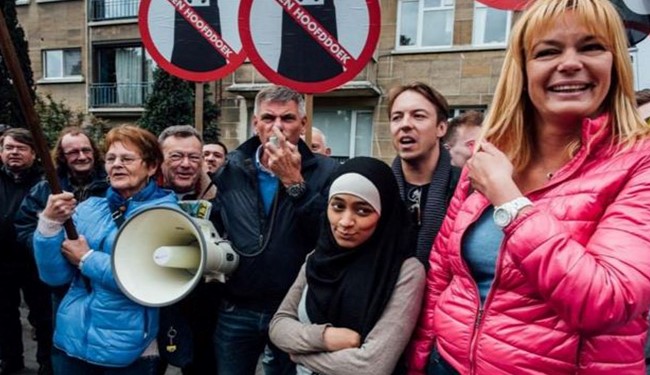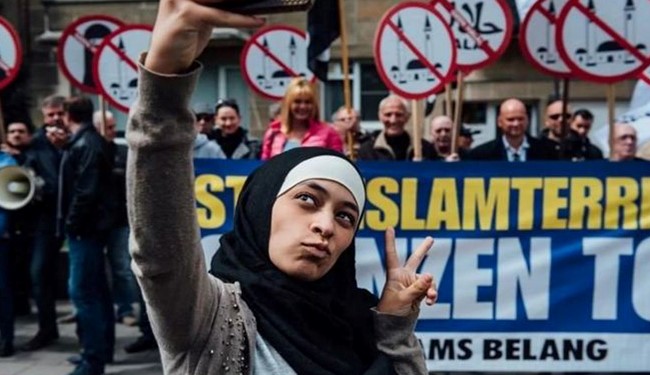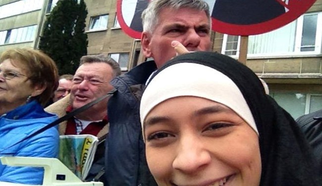 دختر مسلمانی به نام زکیه بلخیری مقیم بلژیک هنگام برگزاری تظاهرات ضد اسلامی در پایتخت این کشور، با مخالفان مسلمانان عکس های سلفی گرفت.