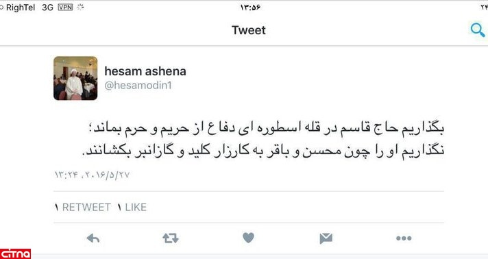 حسامالدین آشنا مشاور فرهنگی رئیسجمهور، مطلبی کنایهآمیز را دربارهی سردار قاسم سلیمانی توییت کرد.