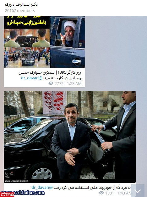 به گزارش سیتنا، کانال رسمی عبدالرضا داوری، یکی از نزدیکان احمدی نژاد رئیس جمهور سابق در انتقاد از لندکروز سواری حسن روحانی با انتشار تصویر زیر نوشت: «آن مرد که از خودروی ملی استفاده می کرد رفت».