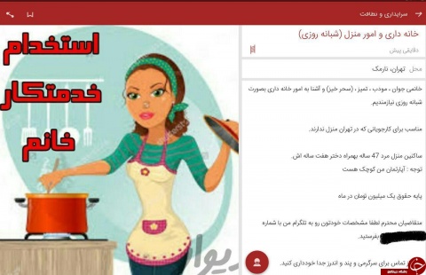 به گزارش سیتنا، آگهی استخدام اینترنتی در فضای مجازی منتشر شد که از یک زن جوان خواسته شده برای یک آقای مجرد در منطقه ونک تهران به صورت شبانه روزی برای امور خدماتی و نظافت کار کند.