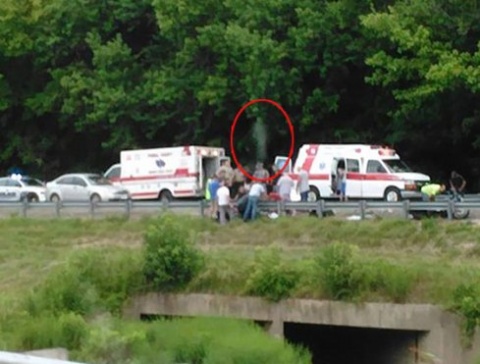 تصویر وهم آور از تصادف منجر به مرگ موتورسواری گرفته شده که شکلی شبیه شبح را بالای بدن قربانی نشان می دهد.