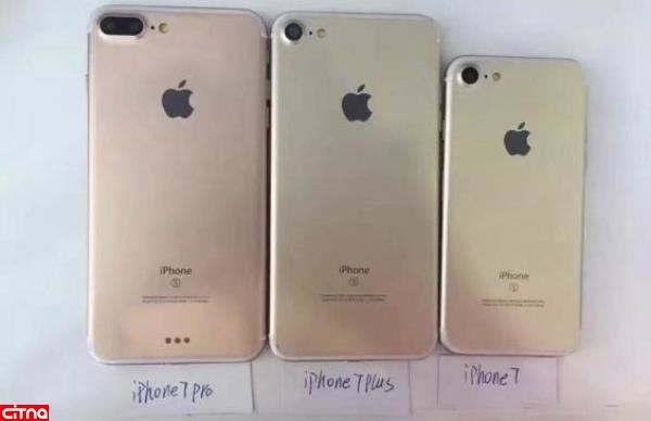 در این عکس، قسمت پشت سه گوشی به تصویر کشیده شده است که در آن می توان آیفون ۷ معمولی، آیفون ۷ پلاس و آیفون ۷ پرو (Pro) را مشاهده کرد.