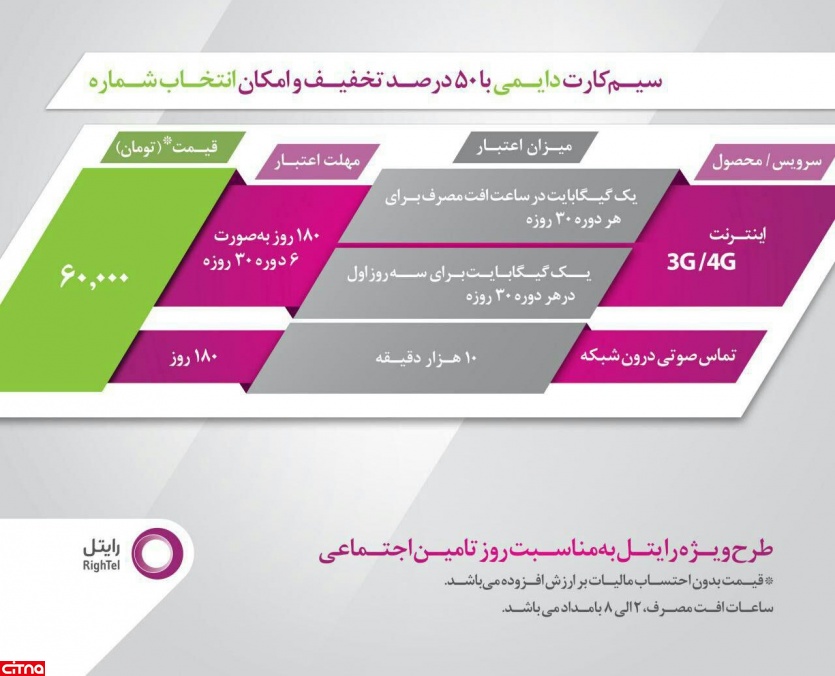 شما بیمه شدگان بیمه تامین اجتماعی میتوانید از 25 تیر ماه سیم کارت دایمی رایتل را به همراه 6 ماه خدمات ارتباطی (اینترنت پرسرعت همراه و تماس صوتی درون شبکه)، با قیمت 60 هزار تومان خریداری نمایید.