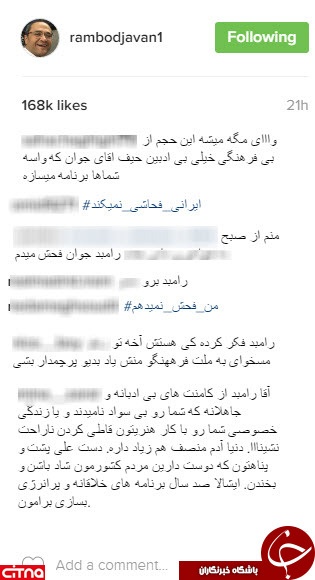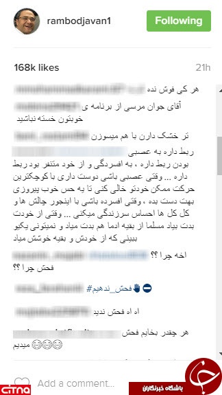 پس از مدتی کوتاه صفحه اینستاگرام رامبد جوان به محلی برای اظهار نظرها مختلف و بعضا ناسزاگویی برخی افراد روبرو شد. همچنین عده ای هم با هشتگ های مختلف از جمله #ایرانی_فحاشی_نمیکند و #فحش_ندهیم و #ناسزا_نگوییم سایر کاربران را به نگفتن بد و بیراه دعوت کردند اما این نصیحت ها انگار برای عده ای مصداق واقعی " نرود میخ آهنین در سنگ فرو" است.