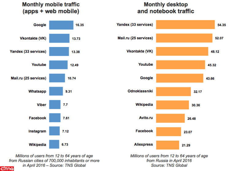 بر اساس آمار منتشر شده از سوی نهاد TNS که یک نهاد مطالعاتی و آماری در حوزه رسانه است، داده های ماه آوریل سال 2016 یعنی سال جاری نشان میدهد که گوگل در حال حاضر میزان بیشتری از مخاطبان را در طول ماه نسبت به سرویس بومی یاندکس در داخل کشور روسیه دارد. بر اساس این آمار در این ماه تعداد 20 میلیون و 500 هزار نفر حداقل یک بار از گوگل در روسیه استفاده کرده اند در حالی که یاندکس آماری در حدود 20 میلیون و 400 هزار نفر داشته است. هرچند تفاوت زیادی در این جا دیده نمیشود اما حاکی از آن است که همچنان گوگل در روسیه جلوتر از یاندکس قرار دارد. نمودار زیر به خوبی وضعیت استفاده از رسانه های مختلف از جمله یاندکس و گوگل را در کشور روسیه و بر اساس دو پلتفرم موبایل و دسکتاپ نشان میدهد: