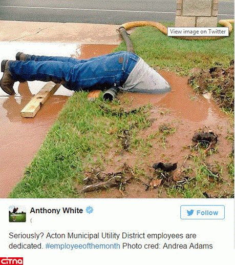 به گزارش سیتنا، اندرو آدام اهل تکزاس که برای بازرسی منطقه آکتون لندن آمده بود با یکی از ماموران شهرداری مواجه شده است که برای تعمیر لوله شکسته آب در جلوی خانه یک پیرزن سرش را به دورن آب گل آلود فرو برده بود.