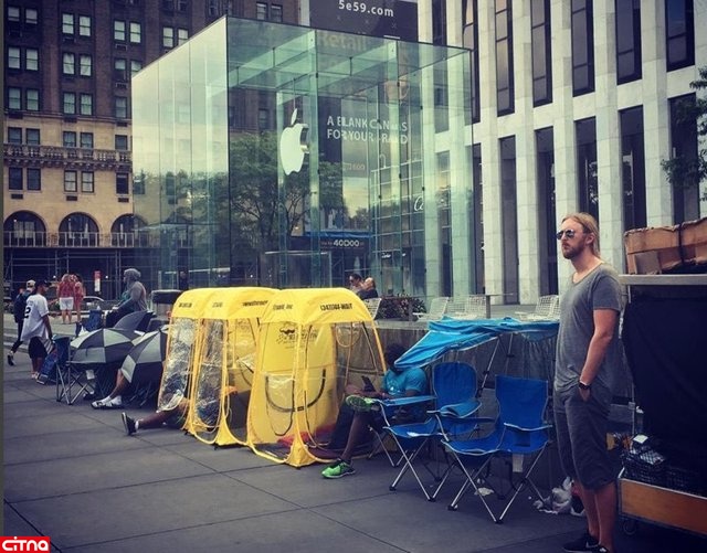 مردم چندین روز است بیرون فروشگاههای اپل در نیویورک، سانفرانسیسکو، لاسوگاس و سایر شهرهایی که نمایندگی رسمی اپل در آنها حضور دارد منتظر هستند و سنگر خود را با صندلی و چادرهای یک نفره حفظ کردهاند.
