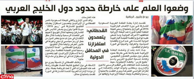 یورو عربی و روزنامه الریاضیه عربستان سعودی مدعی هستند که در طراحی البسه کاروان پارالمپیک ایران علاوه بر استفاده از واژهی انگلیسی خلیج فارس، طرح پرچم ایران نیز بر روی نقشه مرزی عربستان و برخی از کشورهای حوزه همکاری خلیج فارس گسترش یافته است.