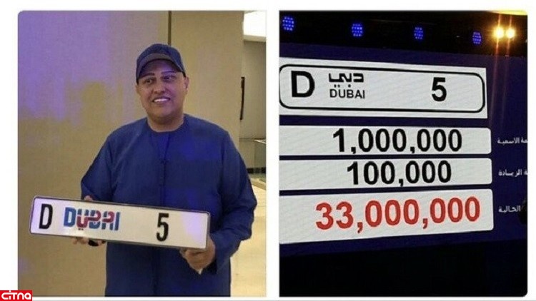 به گزارش سیتنا به نقل از شبکه العالم، این پلاک خاص خودرو به شماره "D5 دبی" در مزایده اداره راه و حمل و نقل دوبی به مبلغ 33 میلیون درهم به یک هندی بهنام "راجا سوهانی" فروخته شد.