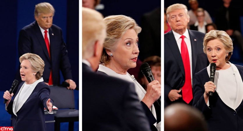 در نگاه های هیلاری کلینتون در عکسِ مربوط به سال 2005، به خوبی می توان رابطۀ خوب او با ترامپ را دریافت، اما در عکس هایی که در روز مناظره از ترامپ و کلینتون منتشر شد، نگاه های ترامپ، او را به شیطانی ترسناک شبیه کرده بود که از پشت به هیلاری کلینتونی خیره شده است که او را به آزار جنسی دختران و زنان متهم کرده است.