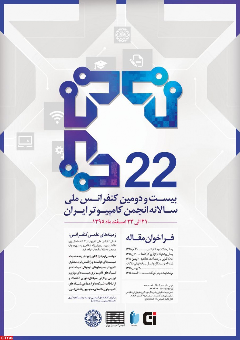 "بیست و دومین کنفرانس ملی سالانه کامپیوتر" از تاریخ 21 الی 23 اسفند ماه سال جاری در محل دانشگاه صنعتی شریف با مشارکت انجمن کامپیوتر ایران، مرکز راهکارهای اطلاعاتی هوشمند دانشگاه صنعتی شریف و پژوهشکده فناوری اطلاعات و ارتباطات پیشرفته دانشگاه صنعتی شریف برگزار خواهد شد.
