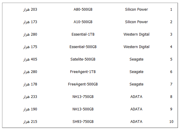 سیتنا - قیمت هارد دیسکهای Seagate - Silicon Power - Western Digital- ADATA مطابق جدول ذیل است.
