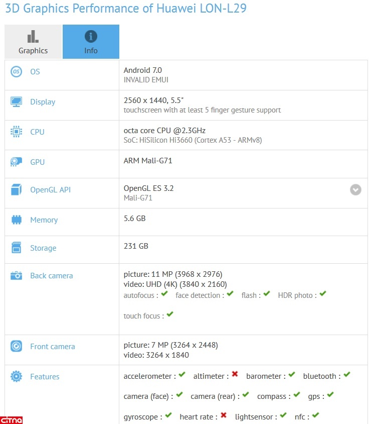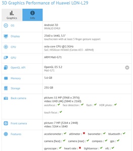 بر همین اساس اخیراً در شاخص فنی GFXBench شاهد ثبوت گوشی 5.5 اینچی با رزولوشن 1440 در 2560 پیکسل هستیم که با پردازنده 8 هستهای Kirin 960 و سرعت 2.3 گیگاهرتز در کنار گرافیک Mali G-71 و 6 گیگ رم/حافظه موقت و 256 گیگ حافظه داخلی میتواند جذابیت خوبی برای کاربران ایجاد کند.