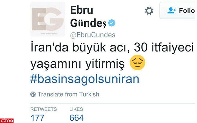 "اِبرو گوندش" خواننده مشهور ترک، با ابراز تاسف از حادثه پلاسکو، با هشتک "ایران سرت سلامت" متنی را توئیت کرد.