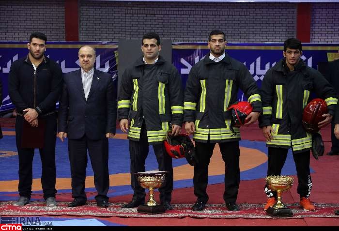 به گزارش سیتنا، در حاشیه مسابقات کشتی جام تختی در مشهد سه کشتی گیر برتر فصل 94-95 حسن یزدانی، قاسم رضایی و جابر صادق زاده هنگام دریافت جوایز خود به احترام آتش نشانان حادثه پلاسکو با لباس و کلاه آتش نشانی بر روی تشک حاظر شدند.