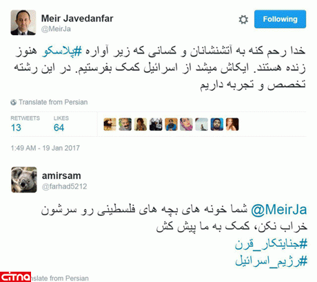 به گزارش سرویس وبگردی سیتنا، پس از انتشار خبر حادثه آتشسوزی در ساختمان پلاسکو حواشی آن بلافاصله در شبکههای اجتماعی دست به دست میشود و هر کاربری به نوعی درباره آن اظهار نظر میکند و نظر خودش را منتشر می کند. یکی از این کاربران مئیر جاودانفر، روزنامهنگار اسرائیلی متولد ایران می باشد که به زبان فارسی تسلط دارد و اکنون در اسرائیل به سر میبرد.