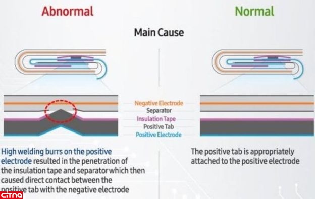 طبق یافتههای این تحقیق، مشکل بر سر ناکافی بودن مقدار مواد عایق در داخل باتریها و همچنین نوع طراحی داخلیشان بود که فضای کافی را برای قرارگیری امن الکترودها در کنار یکدیگر فراهم نمیکرد.