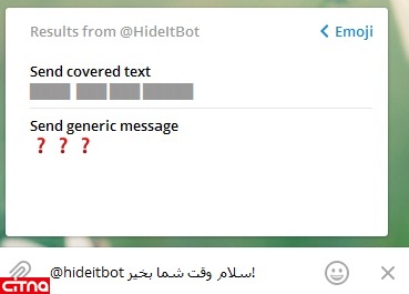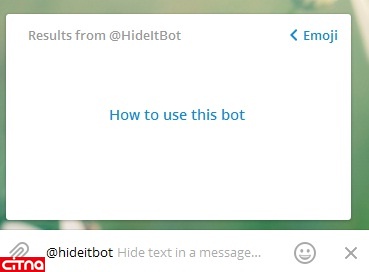 برای اینکه از این ربات استفاده کنید، کافی است که ابتدا صفحه چت خود با یکی از دوستان تان را باز کنید. بعد در قسمت نوشتاری، عبارت @hideitbot را نوشته و یک فاصله بعد از آن ایجاد کنید: