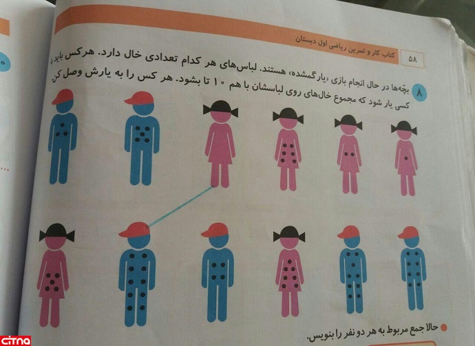 به گزارش سیتنا، باشگاه خبرنگاران ادامه داد: در فضای مجازی نوشته شده این تصویر مربوط به کتاب تمرین و کار ریاضی اول دبستان است و به گونه ای طراحی شده که فقط جنس مخالف را باید بهم وصل کرد تا کامل شوند.