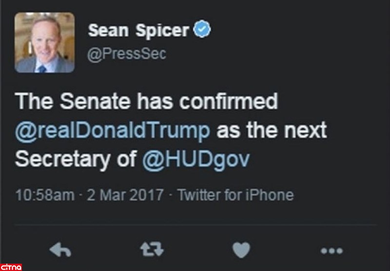 به گزارش سیتنا، "شان اسپایسر" سخنگوی کاخ سفید روز پنجشنبه در صفحه رسمی خود در شبکه اجتماعی توئیتر به صورت اشتباهی توئیت کرد که مجلس سنای آمریکا "دونالد ترامپ" را به عنوان وزیر مسکن و توسعه شهری جدید ایالات متحده آمریکا تایید کرد.