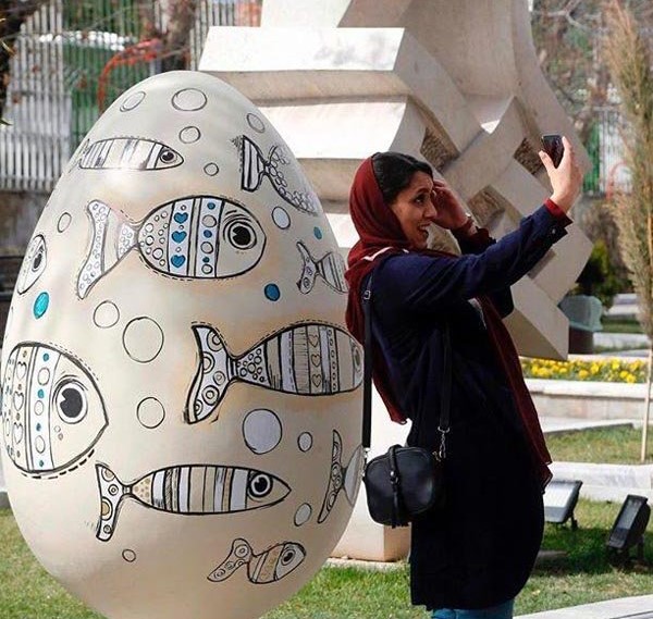 عکسی که دختر جوانی را در یکی از مناطق تهران در حال سلفی گرفتن با تخم مرغ رنگ شده ویژه نوروز نشان می دهد.