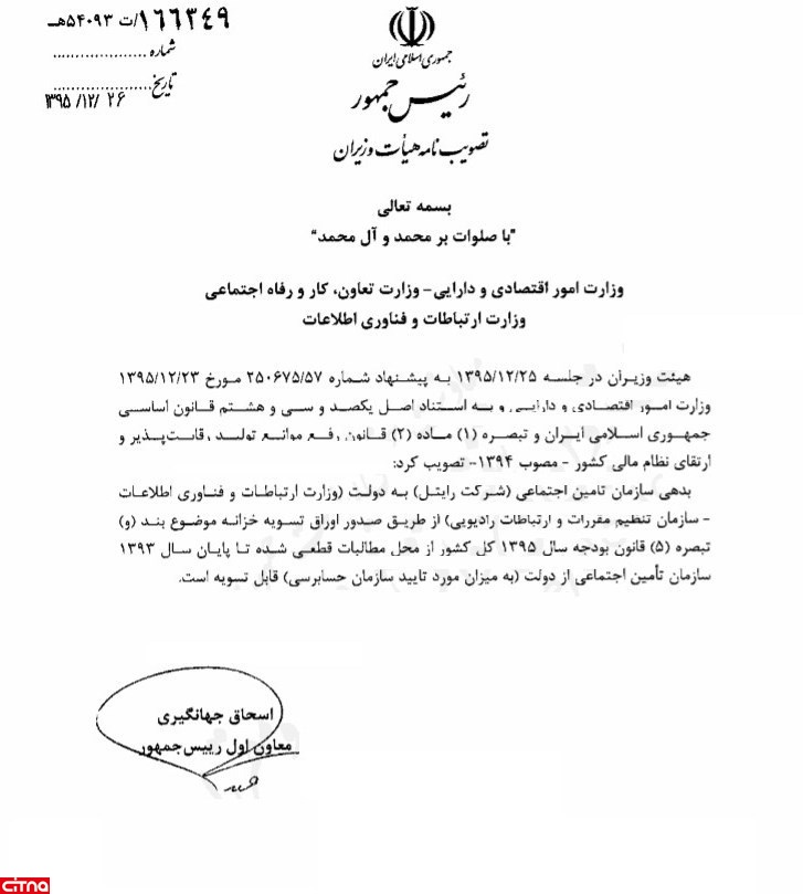 بدهی سازمان تامین اجتماعی (شرکت رایتل) به دولت (سازمان تنظیم مقررات و ارتباطات رادیویی) از طریق صدور "اوراق تسویه خزانه" از محل مطالبات قطعی شده سازمان تامین اجتماعی از دولت قابل تسویه است.
