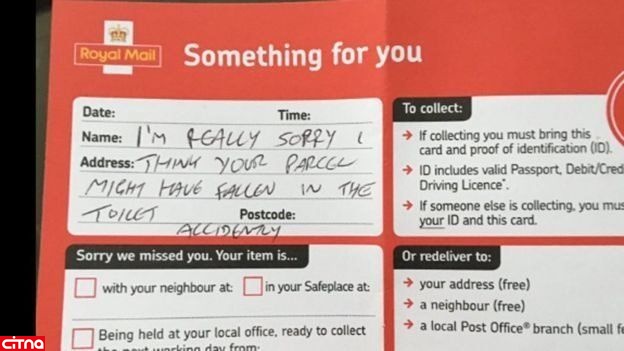 در بریتانیا معمولا پستچیها وقتی صاحبخانه در ساختمان نیست برای او یادداشتی میگذارند و توضیح میدهند که بسته ممکن است کجا باشد.