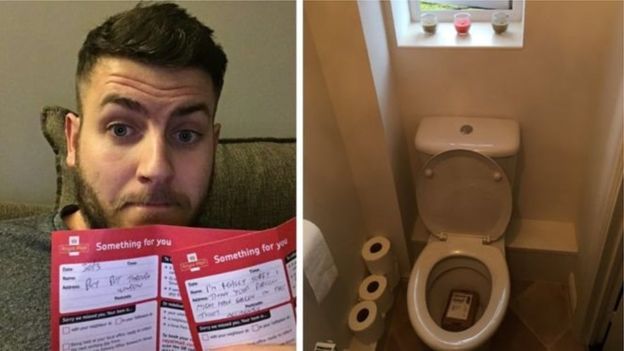 در یکی از یادداشتها پستچی نوشته بود که بسته را از پنجره داخل خانه انداخته است. در یادداشت دوم پستچی عذرخواهی کرده و گفته متاسفانه فکر میکند بسته به طور تصادفی داخل توالت افتاده است.
