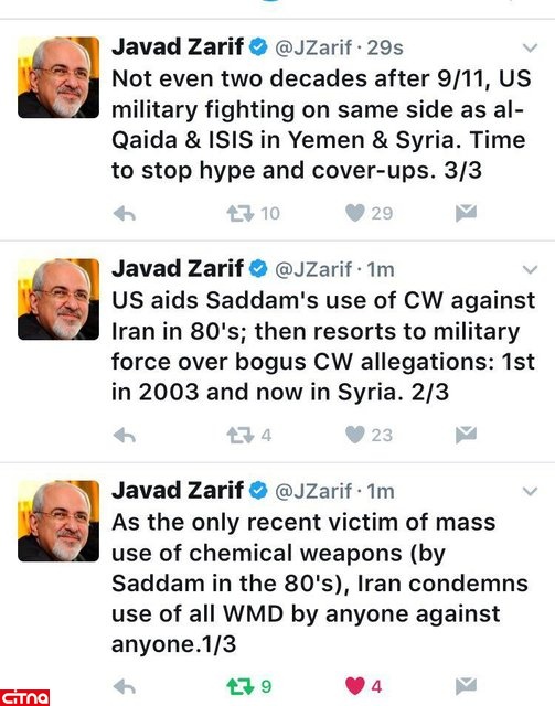 ظریف در ادامه نوشت: آمریکا به صدام برای استفاده از سلاح شیمیایی علیه ایران در دهه ۱۹۸۰ کمک کرد، سپس بر اساس اتهاماتی ساختگی در خصوص استفاده از سلاح های شیمیایی به اقدام نظامی متوسل شده: اولین بار در سال ۲۰۰۳ و اکنون در سوریه.