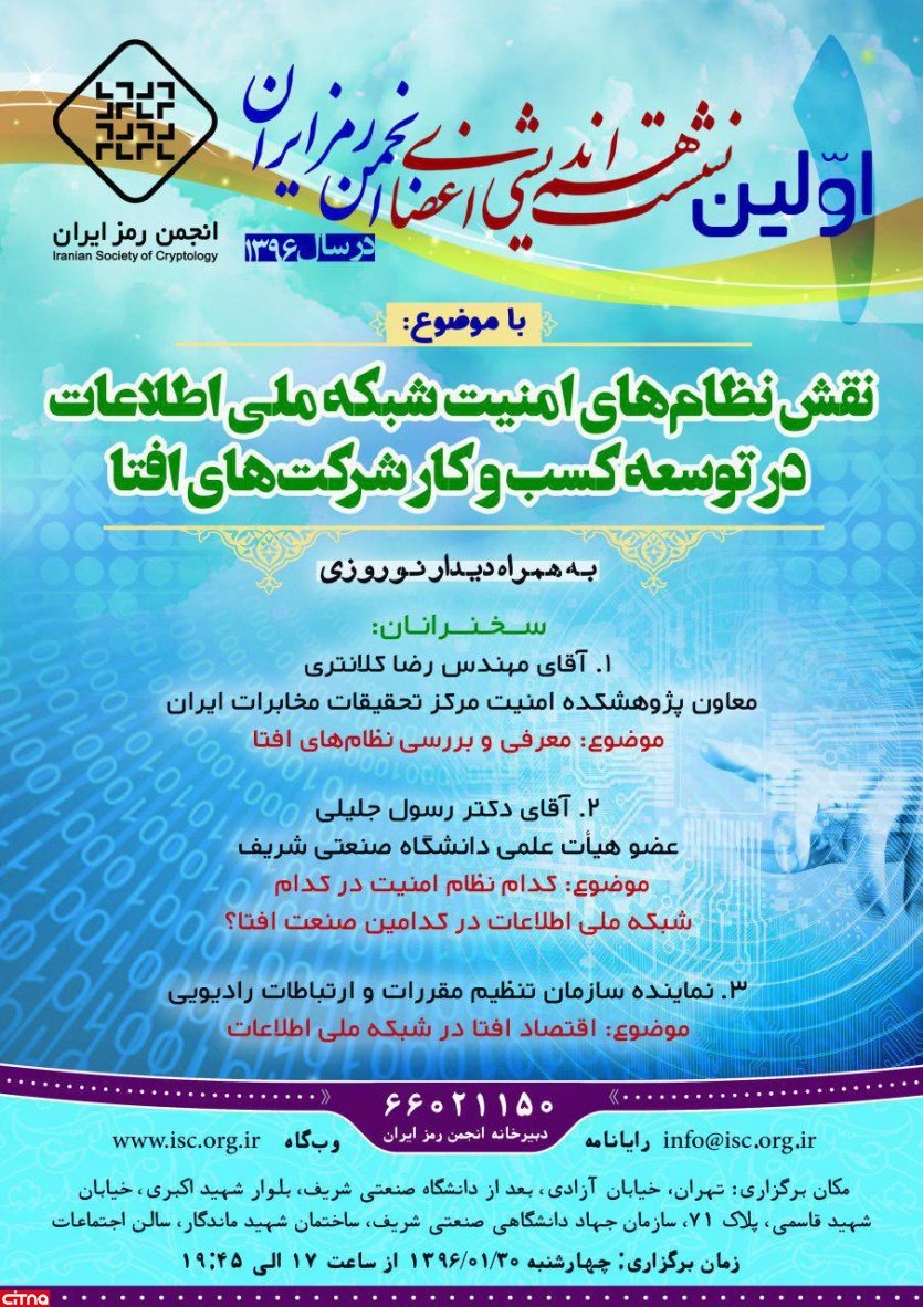 اولین نشست هم اندیشی اعضای انجمن رمز ایران با موضوع نقش نظام های امنیت شبکه ملی اطلاعات در توسعه کسب و کار شرکت های افتا در تاریخ چهارشنبه 96/01/30 از ساعت 17 الی 20 برگزار خواهد شد.