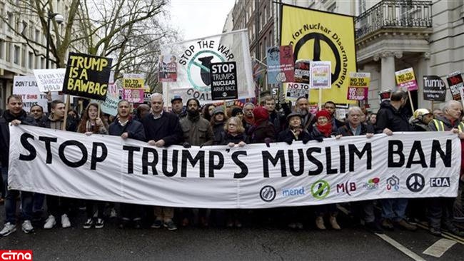 تظاهرات کنندگان که علیه حکم جنجالبرانگیز ترامپ درزمینهٔ منع روادید به شهروندان شش کشور اسلامی در لندن تظاهرات کردهاند. (عکس از خبرگزاری فرانسه)
