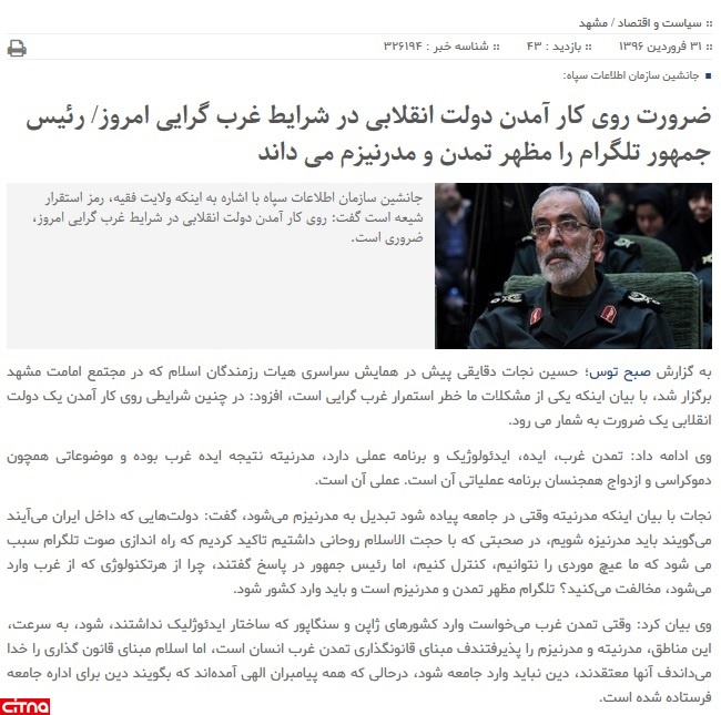 جانشین سازمان اطلاعات سپاه: رئیس جمهور، تلگرام را مظهر تمدن و مدرنیزم می داند