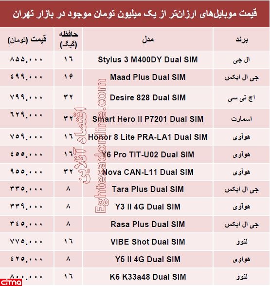 قیمت روز موبایلهای ارزانتر از یک میلیون تومان موجود در سطح بازار تهران منتشر می شود.