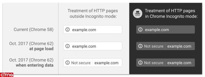به گزارش سیتنا به نقل از آى تى ورلد، این بدان معناست که گوگل کروم براى صفحات HTTP در نوار آدرس عبارت “not secure” را نمایش خواهد داد. این هشدار به صورت پیش فرض براى تمامى صفحات HTTP نمایش داده خواهد شد. این درحالى است که در گذشته این هشدارها تنها در زمان ورود رمز عبور و اطلاعات کارت اعتبارى، در صفحات HTTP نمایش داده مىشد.