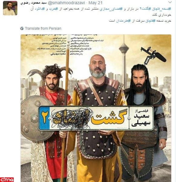 رضوی نوشت: "نسخه قاچاق گشت٢ در بازار و فضای مجازی منتشر شده از همه بخواهید از خرید و دانلود آن خودداری کنند."