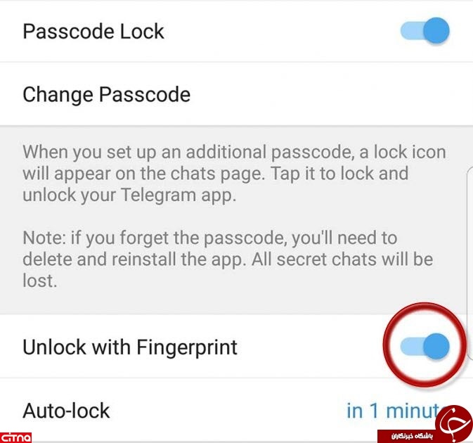 با تنظیماتی که تلگرام در اختیار کاربران می گذارد می توانید برنامه را با اثرانگشت قفل کنید.