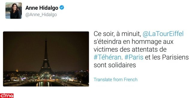 به گزارش سیتنا، آن هیدالگو شهردار پاریس در توییتر اعلام کرد که چراغ‌های برج ایفل امشب به احترام جانباختگان حوادث تروریستی تهران خاموش می شوند.