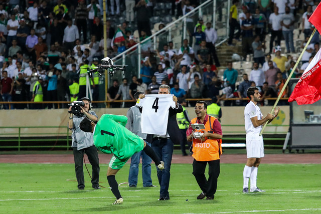 کارلوس کیروش به نشانه چهارمین صعودش به جام جهانی با پیراهن شماره ۴ ایران امروز دور افتخار زد.