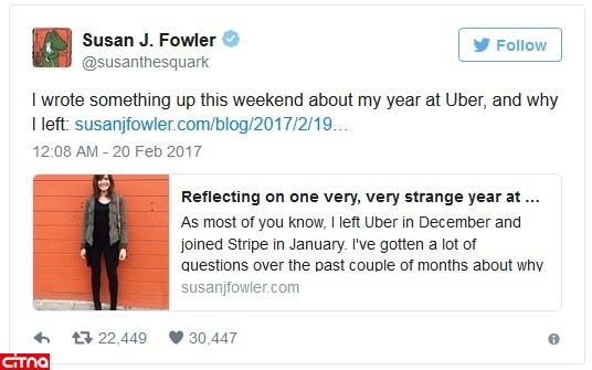 حالا اوبر با بدنامی بزرگی رو به روست. اوبر با گذشت چند ماه از زمانی که سوزان فولر، یکی از کارکنان سابق زن این کمپانی، در فوریه امسال اوبر را به طور رسمی به "بیپروایی در آزار جنسی" متهم کرد، هر روز بیش از پیش با گرفتاری رو به روست. نتیجه تحقیقاتی که پس از آن انجام گرفت روز سهشنبه (۱۳ ژوئن/ ۲۳ خرداد) در گزارشی منتشر شد. در این گزارش پیشنهاد شد که قدرت فراگیر تراویس کالانیک، مدیر عامل اوبر، کاهش یابد و کنترل بیشتری روی چگونگی رفتار مدیرها انجام گیرد. پس از انتشار این گزارش، کالانیک اعلام کرد که برای مدتی از شرکت دور میماند.