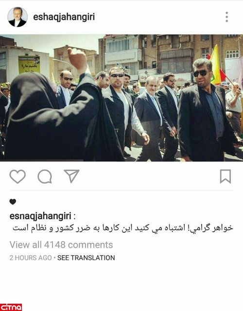 به گزارش سیتنا، اسحاق جهانگیری با انتشار تصویر خانمی که علیه او در جریان راهپیمایی شعار میداد، در صفحه اینستاگرام خود پاسخی را که در واکنش به وی داده بود منتشر کرد و نوشت: خواهر گرامی! اشتباه میکنید؛ این کارها به ضرر کشور و نظام است.