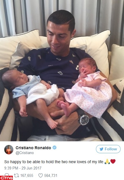 کریستیانو رونالدو ستاره تیم ملی فوتبال پرتغال و باشگاه رئال مادرید اسپانیا، اولین تصویر از دو پسر دوقولیش (ایفا و ماتیو) را در حساب کابری توییتر خود منتشر کرد.
