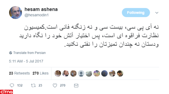به گزارش سرویس وبگردی سیتنا، حسامالدین آشنا، در حساب توئیتری خود نوشت: «نه آیپیسی، ۲۰۳۰ و نه زنگنه فانی است. کمیسیون نظارت فراقوهای است، پس اختیار آتش خود را نگاه دارید و دستان نه چندان تمیزتان را نفتی نکنید.»