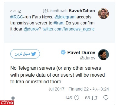 پاول دورف، میگوید: تلگرام هیچ یک از سرورهایش را، یا هیچ سروری را که اطلاعات شخصی کاربران روی آن باشد، به ایران منتقل نخواهد کرد.