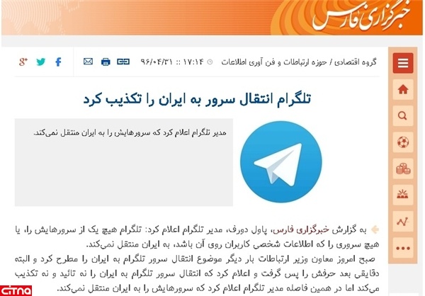 همچنان که محمد جواد آذری جهرمی معاون وزیر ارتباطات در واکنش به اخبار متناقضی که درباره پذیرش انتقال سرور تلگرام به ایران از سوی مدیران این پیامرسان مطرح شد، در صفحه شخصی خود در اینستاگرام مطلب نوشت که «طرح اخبار نادرست درباره انتقال سرور تلگرام قبل از حصول نتیجه کمکی به دولت نخواهد کرد.»