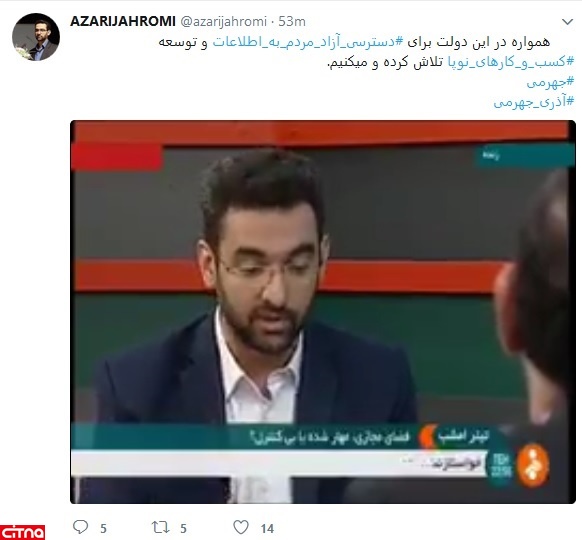 گزینهی احتمالی سکانداری وزارت ارتباطات و فناوری اطلاعات دولت دوازدهم با حضور در توئیتر و انتشار بخشی از فیلم مناظرهی تلویزیونی با موضوع انتقال سرورهای تلگرام به ایران، به لزوم دسترسی آزاد مردم به اطلاعات تاکید کرد.
