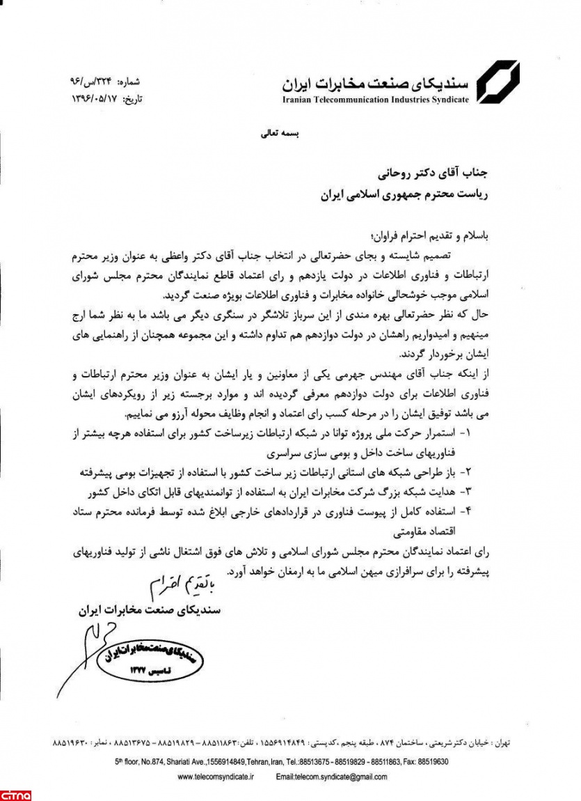 تصمیم شایسته و بجای حضرتعالی در انتخاب جناب آقای دکتر واعظی به عنوان وزیر محترم ارتباطات و فناوری اطلاعات در دولت یازدهم و رای اعتماد قاطع نمایندگان محترم مجلس شورای اسلامی، موجب خوشحالی خانواده مخابرات و فناوری اطلاعات، به ویژه صنعت گردید.