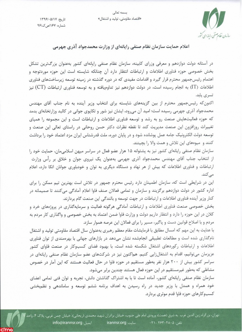 ضمن تقدیر و تشکر از رئیسجمهور محترم که از میان گزینههای شایسته برای انتخاب وزیر فناوری اطلاعات و ارتباطات، جناب آقای مهندس محمدجواد آذری جهرمی را برگزیدند؛ امید است، نمایندگان محترم مجلس شورای اسلامی نیز با رای اعتماد خود حمایت از حضور ایشان در مقام عالی وزارت، حمایت کنند. تا ایشان نیز شور و تکاپوی جوانی در کالبد وزارتخانهای بدمد که حوزه فعالیتهایش صنعت رو به رشد و توسعه فناوری اطلاعات و ارتباطات است و این مجموعه را همپای تغییرات روزافزون این صنعت مدیریت کند تا نقطه نظرات دکتر حسن روحانی در راستای تعالی این صنعت و توسعه دولت الکترونیک جامه عمل پوشانده شود و در پایان دوره، ملت قدرشناس ایران مزد اعتماد خود را برداشت کنند و میوههای این تلاش و همت والا را بچینند.