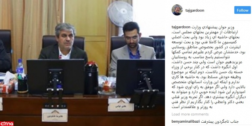 غلامرضا تاجگردون، عضو فراکسیون امید در اینستاگرامش نوشت: "وزیر جوان پیشنهادی وزارت ارتباطات از مهمترین بحثهای مجلس است. بحثهای حاشیهای زیاد بود، ولی بحث اصلی کمیسیون ما کاملا فنی بود و بحث توسعه اینترنت در کشور بخصوص مناطق روستایی بود. خدمتشان عرض کردم علیرغم تمامی کمکها نتوانستیم پاسخ مناسب به روستاییان عزیز بدهیم. جوان است، ولی چند حسن داشت. اول انگیزه داشت که در کنار برخی از وزراء خسته یک حسن بالاست. دوم اینکه بر موضوع وظیفه خودش مسلط بود. به حاشیهها کاری ندارم و اینکه این وزارت انسانهای متخصص بالایی دارد، ولی اگر موفق به رای آوری شود که امیدوارم این شود، آینده خوبی دارد و میتواند به دیگران انگیزه بیشتری دهد. اگر تجربه وزیر قبلی بعنی دکتر واعظی را کنار بگذاریم از نظر فنی به روزتر و علاقمندتر است".