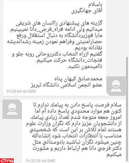 * محمد صادق کیهان پناه، عضو انجمن اسلامی دانشگاه تبریز به اسحاق جهانگیری نوشت: ما با وزیر دانشگاه به دنبال استقلال و رفع حصار امنیتی و فراهم نمودن زمینه رشد اندیشه نقادانه بودیم. ناامیدمان نکنید. معاون اول رئیس جمهور پاسخ او را داد و گفت: امروز متوجه شدم تعداد زیادی پیامک از دانشجویان عزیز دارم، که نگران وزارت علوم هستند؛ تمتم تلاش بر این است که شخصیتی متناسب با انتظارات انتخاب شوند؛ انشالله چنین میشود، نگران نباشید. با دوستانی مثل دکتر فرجی دانا ارتباط داریم و مشورت کنیم.